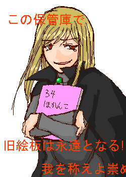 公式絵板がなんとなく自分の肌に合わないなと感じ始めた頃に旧絵板に出会い、数々の良絵やネタをそれはそれは美味しゅう頂いたのはよい思い出です。 010 2008/11/24 (Mon.) 00:31:42 OFFの目印に ピンク色のバインダーに34号と書いて持っていったのは懐かしい思い出w あの板にあわなかったらいろんな人とも会えなかったなぁ。ほんと、色々お世話になったぜ。ふぉーえばー!
