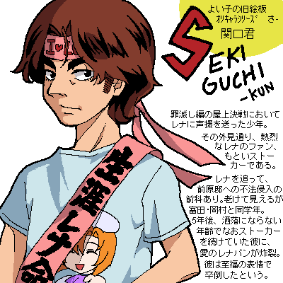 [26] 2008/12/31 (Wed.) 21:56:23  | ゲンカン 2008/12/31 (Wed.) 22:01:54 いうほど旧と付き合いが長いわけではないですが、ROM専的な意味で色々楽しませていただきました。 あの熱き数々の祭りを胸に、旧の記憶よ!永久となれ! あいたそ 2008/12/31 (Wed.) 22:26:55 ROM専出身仲間ですね! 旧絵板ではカラケや下半身が触手のイメージがあった彼女ですが、すんげー可愛い 猫 2008/12/31 (Wed.) 23:45:02 なんだかんだで普通に可愛く描かれてたのも彼女が多いような気が! この汎用性が人気の秘訣だと思うんです 祐樹 2009/1/2 (Fri.) 20:35:07 魅音もみおんw扱いの結果、登場回数は中々のものだろうw 本編で「空気投げ」した時、彼女の運命は決まったw きむ 2009/1/3 (Sat.) 00:14:12 ちっこい魅音かわいいなぁ 絵板では色々と愛されてましたねw 1 2009/1/10 (Sat.) 12:27:42 彼女はみおんw含め、旧絵板の看板娘と言っても過言でないくらいの大活躍でしたね 私は・・・主にネタ方向の弄りばかりだった為に未だに普通の魅音が上手く描けませんw |