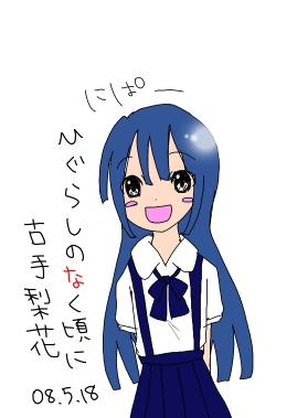 [1355] まぁ、こんなかんじ? 2008/06/21 (Sat) 21:09 1時間20分24秒  | 彩香 2008/06/21 (Sat) 21:09 私の想像では、クールになれ!はこんな感じですね。 本当はレナとか描こうと思ってたけど変更しました。 彩香 2008/06/21 (Sat) 21:27 あ、すいません誰かに質問です。絵を縮めて投稿するにはどうすればいいんですか? ↑ なんていうか絵をクリックしたら元の大きさになるあれです。 2008/06/21 (Sat) 21:44 重い絵だと勝手に小さくなるんだと思う。
